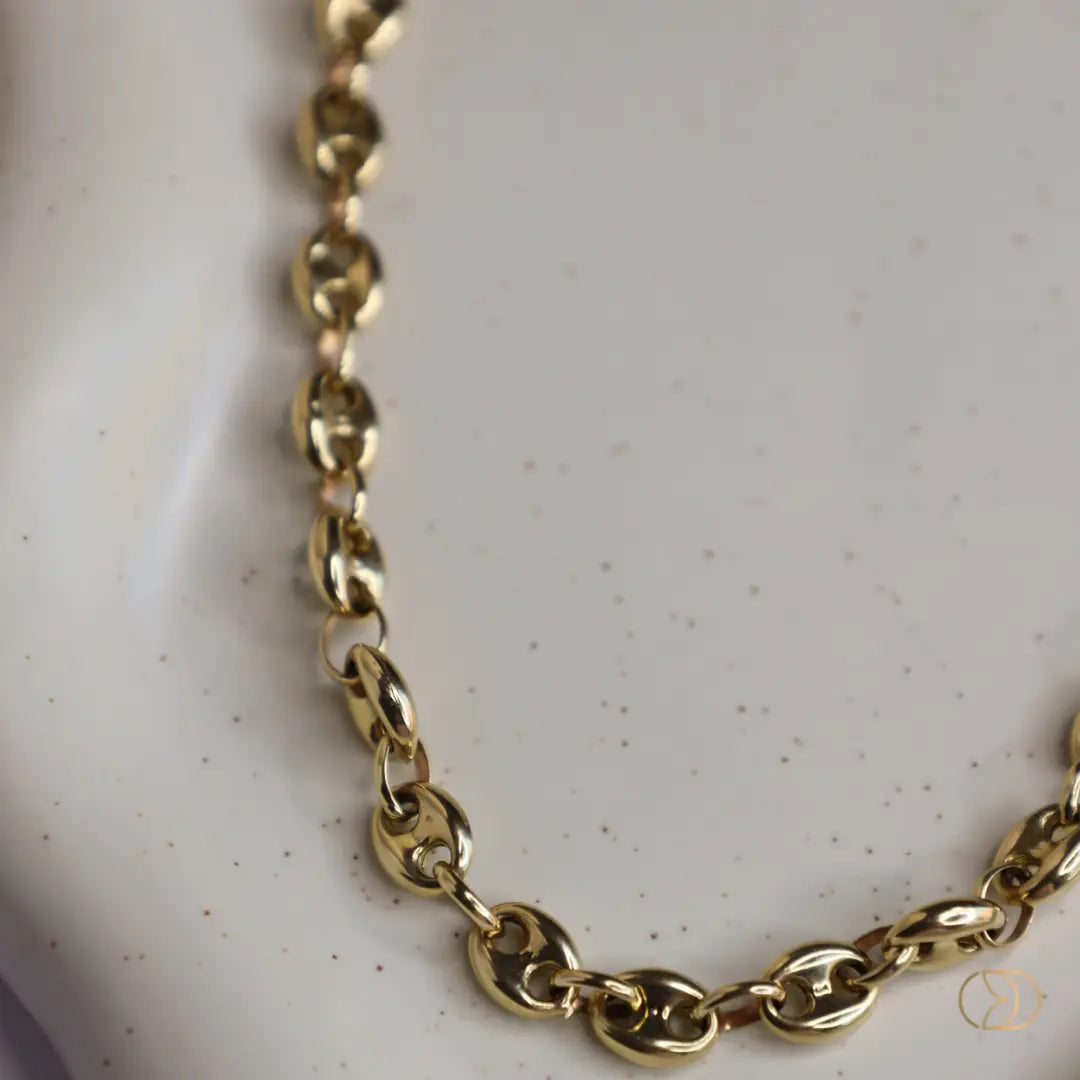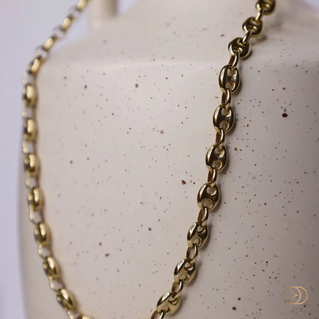 La cadena marinera puff de oro 14k es una pieza de joyería elegante y atemporal, conocida por su distintivo diseño de eslabones ovalados inspirados en las cadenas náuticas. Elaborada en oro de 14 quilates, esta cadena destaca por su acabado abombado o "puff", que le otorga un volumen suave y brillante, realzando su presencia sin perder la comodidad